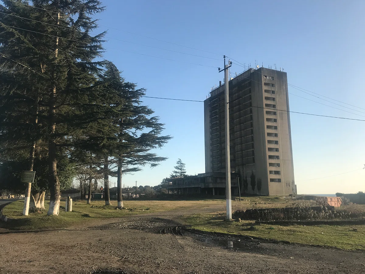 Очамчира встречает гостей заброшенной железобетонной громадиной на 17 этажей на берегу моря. Это почти достроенный, а потом заброшенный советский дом отдыха. Здание совершенно мертвое, только на крыше стоят спутниковые антенны. Когда их поставили? Спросить не у кого. На улице ни души.
