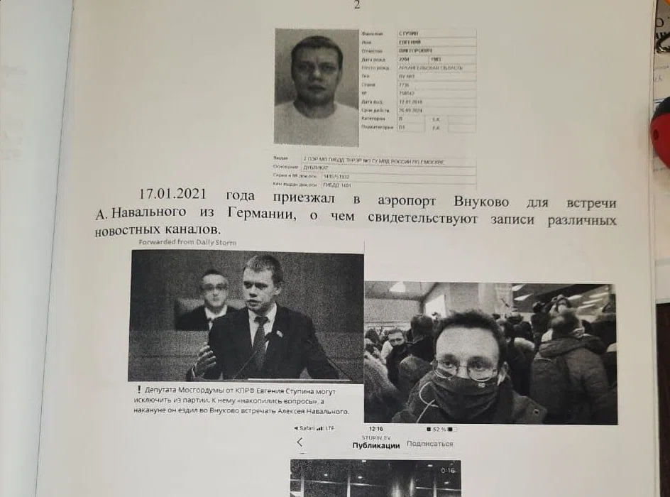 Как следует из протоколов, составленных на Ступина (имеются в распоряжении «Новой газеты»), политику вменяют в том числе и то, что он был во Внуково 17 января: «Но меня во Внуково не было — я прибыл сразу в Шереметьево, потому что был рядом с Шереметьево», — заявил депутат. Остальные «нарушения» Ступина выявили с помощью камер видеонаблюдения в Москве на акции 23 января.