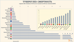 В частности, сравнили данные заболеваемости туберкулезом и смертности от него по странам как “большой двадцатки” (G20), так и бывшего СССР – в расчете на 100 тысяч их жителей. Текущие оценки ВОЗ – за 2019 год.
