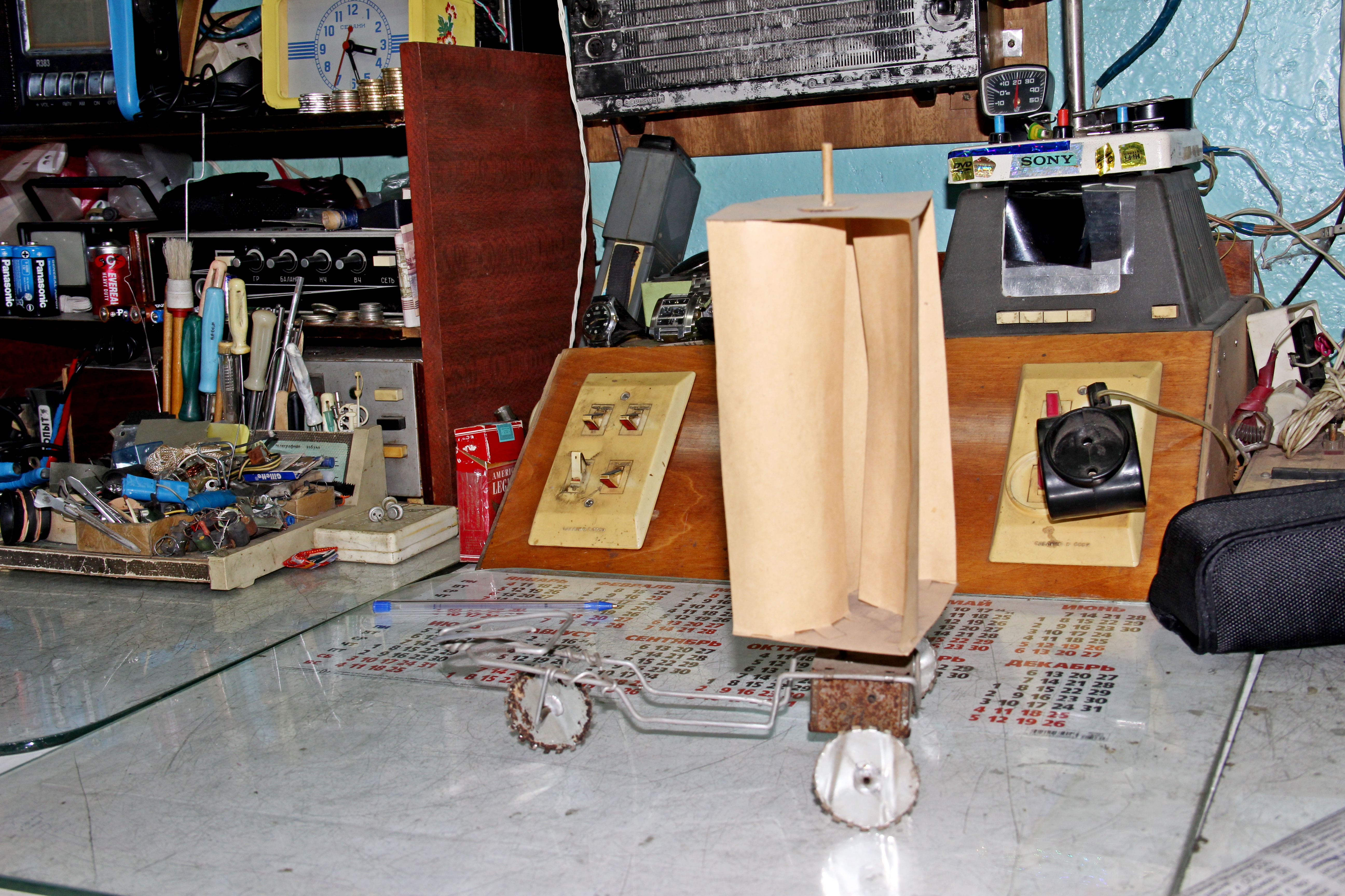 Основные инструменты Гришаева – болгарка, дрель и сварочный аппарат. Сколько именно аппаратов он изобрел, Гришаев не считал, но говорит, что часть из них уже списана. Например, ветромобиль. Когда-то изобретатель его создал и несколько раз тестировал, разъезжая по огороду. Но пришел к выводу, что конструкция не слишком устойчива при сильном ветре. Можно было доработать, но поскольку ветра, способные заставить аппарат двигаться, в регионе дуют редко, отказался от совершенствования конструкции. На память осталась миниатюра ветромобиля.