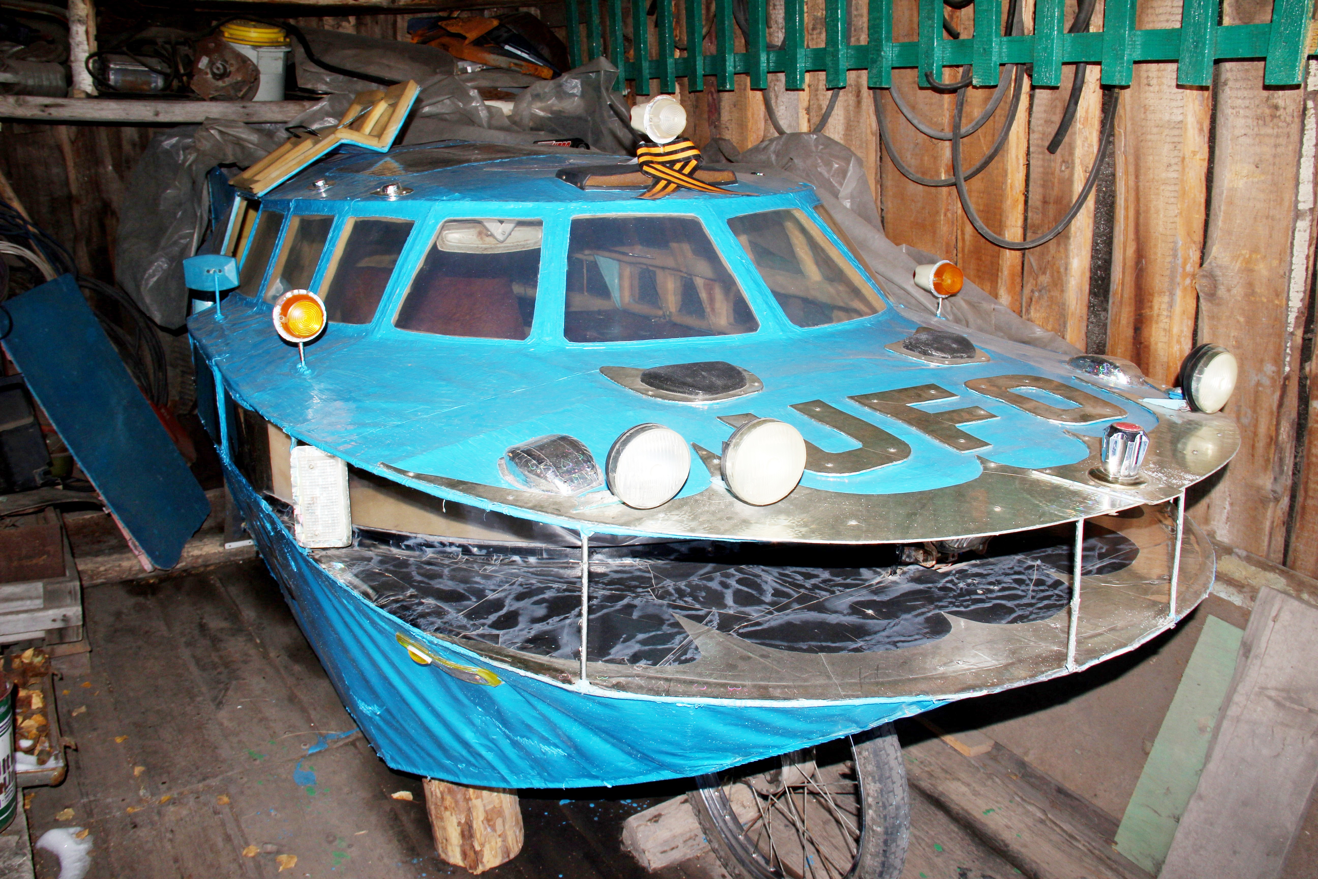 – Сделал я его лет тридцать назад. Кабина вырезана из ДВП, вместо стекол – тоже пленка. Двигатель – двухтактный, 45 кубических сантиметров. Расход бензина – полтора литра на пятьдесят километров. Два привода: заднее правое – это двигатель, заднее правое – педали. Может разгоняться до 30 километров. У него три колеса. Я могу ехать, как обычно мы ездим на машине, а могу за счет того, что кручу педали. Хотя крутить их, конечно, тяжелей, чем на велосипеде. Кто-то один раз сказал, что машина на НЛО похожа. Ну, а я написал UFO – по-английски. Тогда эта тема модной была.