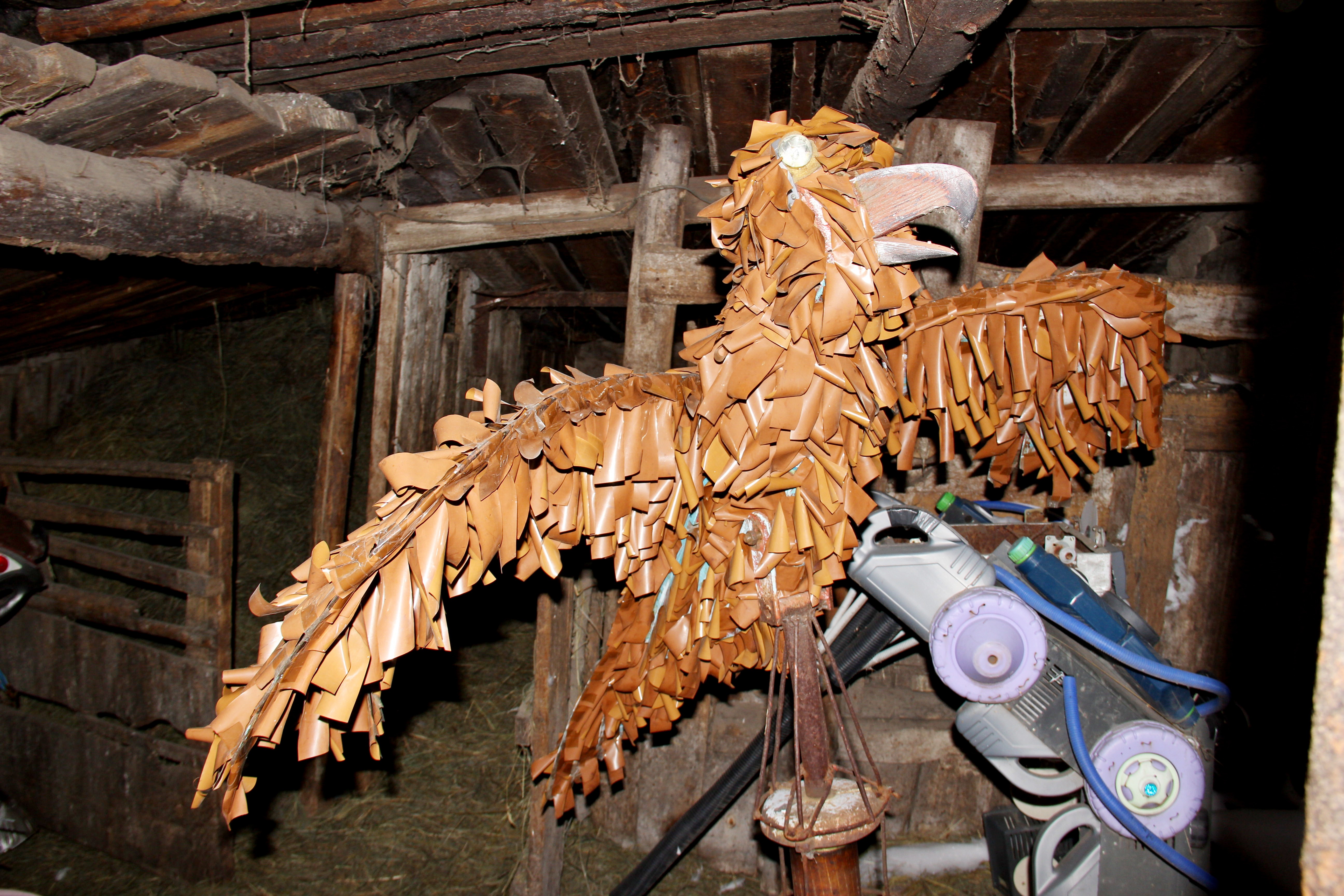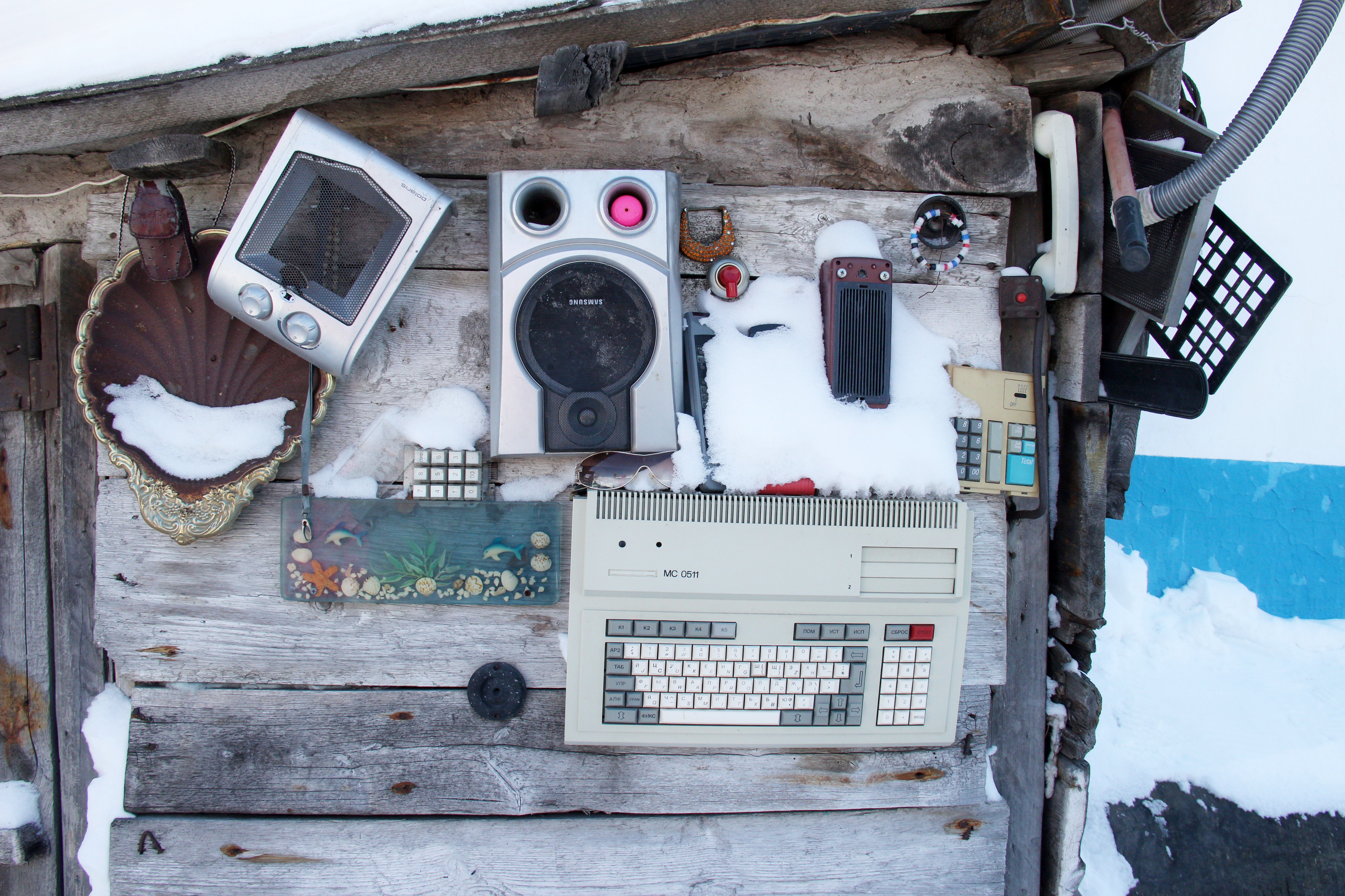 Сразу у входа во двор, на дощатой стене сарая, можно увидеть, как говорит сам Гришаев, "набор всякой ерунды"– висящие компьютерные клавиатуры, колонки от музыкальных центров, телефонная трубка…