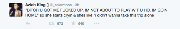 Парню Золы не понравилось, что она собралась в поездку с незнакомкой. Девушке пришлось его успокаивать: «Это просто маленькая белая цыпочка. Что может пойти не так?».