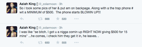 По словам Золы, Руди отобрал у неё телефон и против её воли создал объявление с её снимками на сайте Backpage, где секс-работницы предлагают свои услуги. К этому моменту Зола начала паниковать. Однако Джесс расплакалась и попросила не оставлять её. Зола не могла понять, жертва ли Джесс или активная участница происходящего: «Я не хотела её бросать. Мне стало её немного жаль». Девушка также испугалась Руди, ведь он знал, где она живёт и работает.
