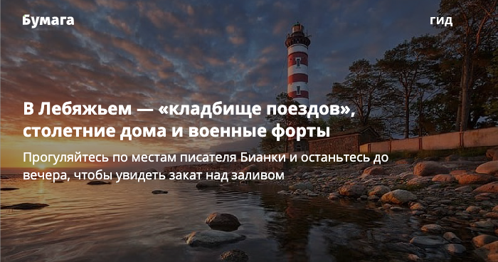 Поселок Лебяжье находится в полутора часах езды от Петербурга. Это места писателя Виталия Бианки, здесь сохранились столетние дома и дореволюционные церкви, а у железнодорожной станции располагается «кладбище поездов», по которому водят экскурсии. Через Лебяжье проходит экотропа — она ведет к военным фортам начала ХХ века, Шепелевскому маяку и серферской бухте.