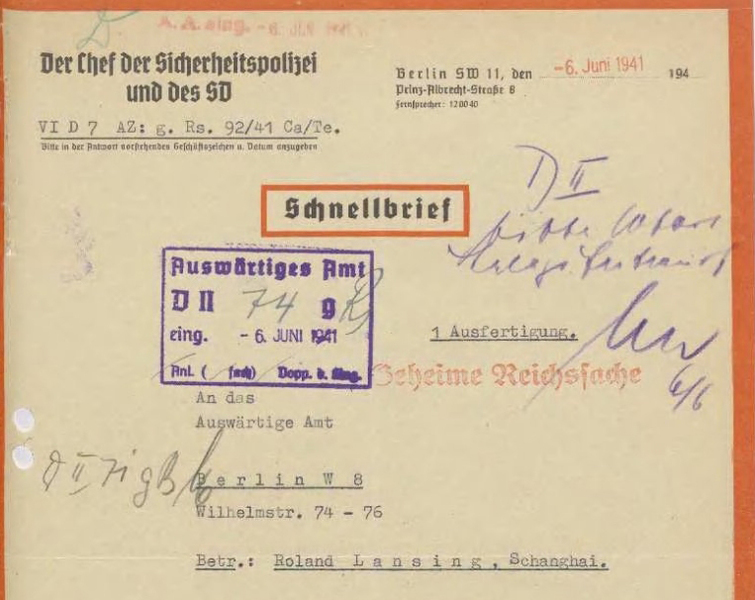Лансингу следует указать, что немедленно по возвращении в Берлин он должен позвонить хауптштурмфюреру СС Карстену по телефону 897611. Кроме того, просим, чтобы немецкое консульство в Шанхае сообщило дату отъезда Л., чтобы можно было установить, когда Л. прибудет в Берлин.
