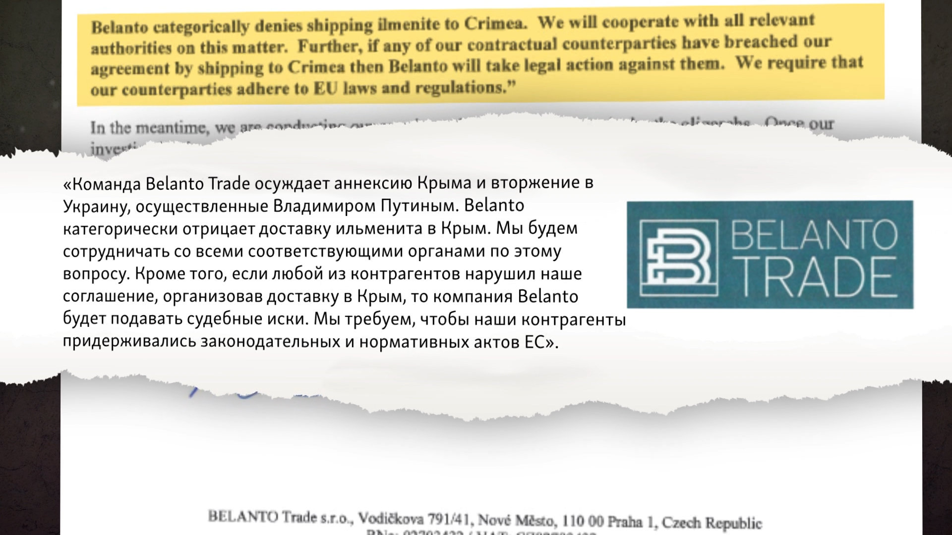 «Команда Belanto Trade осуждает аннексию Крыма и вторжение в Украину, совершенные Владимиром Путиным. Belanto категорически отрицает доставку ильменита в Крым. Мы будем сотрудничать со всеми соответствующими органами по этому вопросу. Кроме того, если любой из контрагентов нарушил наше соглашение, организовав доставку в Крым, то компания Belanto будет подавать судебные иски. Мы требуем, чтобы наши контрагенты придерживались законодательных и нормативных актов ЕС», ‒ ответили на запрос Крым.Реалии в компании Belanto Trade.
