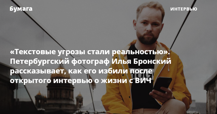 Петербургский фотограф Илья Бронский рассказал, что 3 апреля неизвестный ударил его в лицо во дворе в центре города. Это произошло вскоре после того, как Бронский дал интервью изданию TJournal о жизни с положительным ВИЧ-статусом. У петербуржца зафиксировали перелом носа и травмы перегородки.