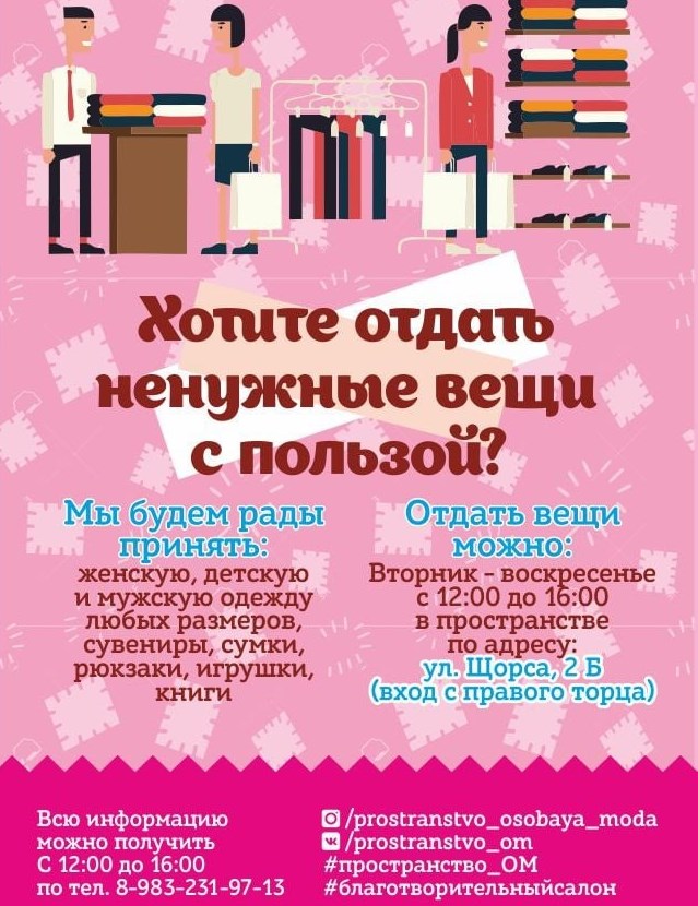 Подробнее о работе салона можно прочесть или спросить в соцсетях «Пространства Особая мода» в Instagram и ВКонтакте. Оставить заявку на бесплатное получение вещей можно по телефону: 8-913-231-97-13. Адрес: улица Щорса, 2 Б (вход с правого торца).