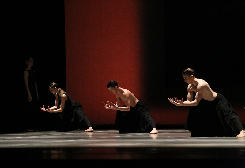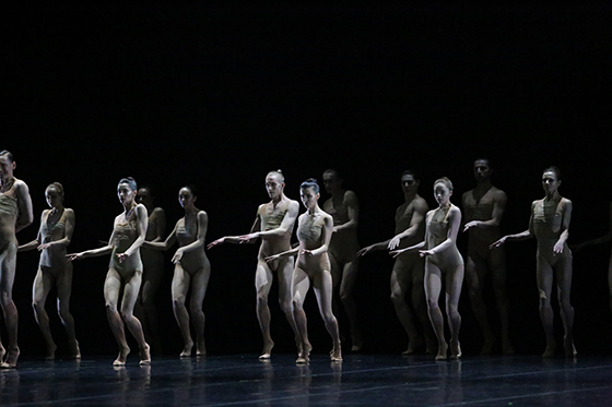 В основе — шаг на высоких полупальцах, с которых танцовщики почти не спускаются весь получасовой балет (за время репетиций избранные артисты нехило закачали икры и голеностопные суставы). Шаг не прекращается даже на одном месте, лишь меняется амплитуда. Пластику можно грубо назвать маньеристской: ход с преувеличенным выниманием ног через колено, отброшенный корпус, вывернутые в плечах руки, жеманные перемены позировок — имитация мягкости при крайнем напряжении. При этом у четырнадцати исполнителей остается зазор для артистического выражения (оно оказывается чем-то более сложным, нежели привычная в балете игра лицом).