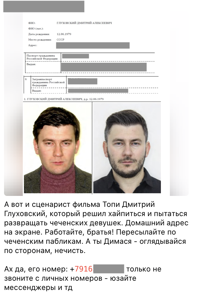 В нескольких чеченских телеграм-каналах выложили паспортные данные российского писателя Дмитрия Глуховского с призывами привлечь его к ответу. Он написал сценарий к сериалу "Топи", в котором есть героиня – чеченская девушка, роль играет актриса Софья Володчинская.