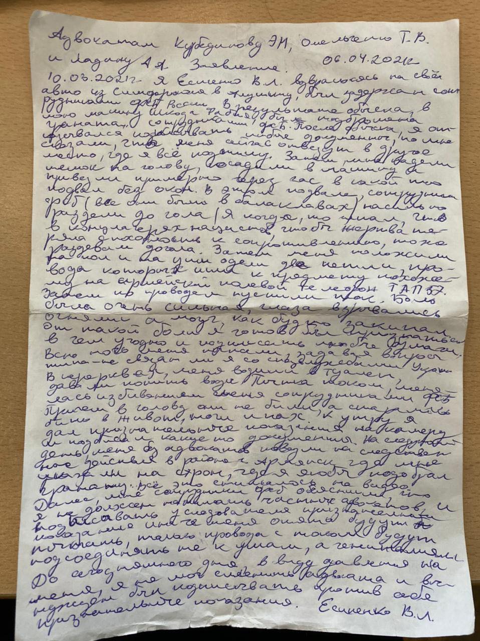 Независимые адвокаты предоставили Крым.Реалии заявление, написанное Владиславом, где он описывает обстоятельства ареста и издевательства, которым его подвергали. Редакция публикует рассказ Владислава.