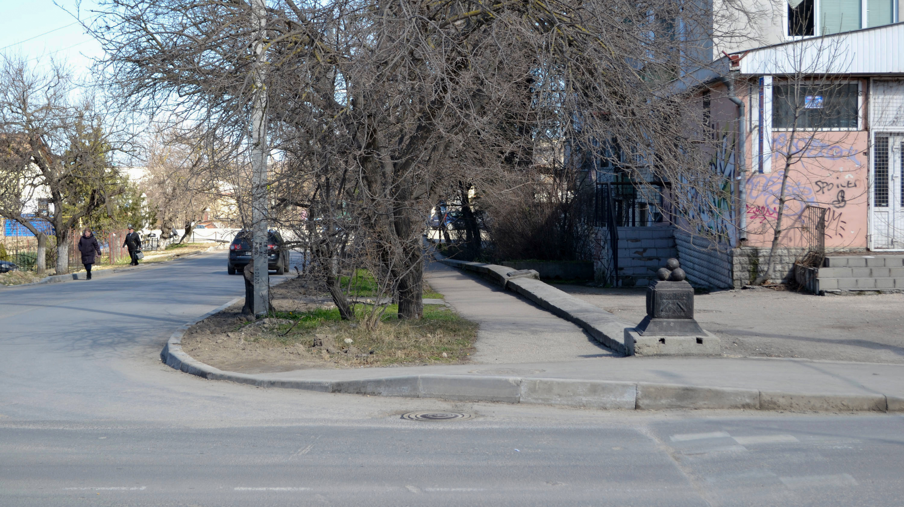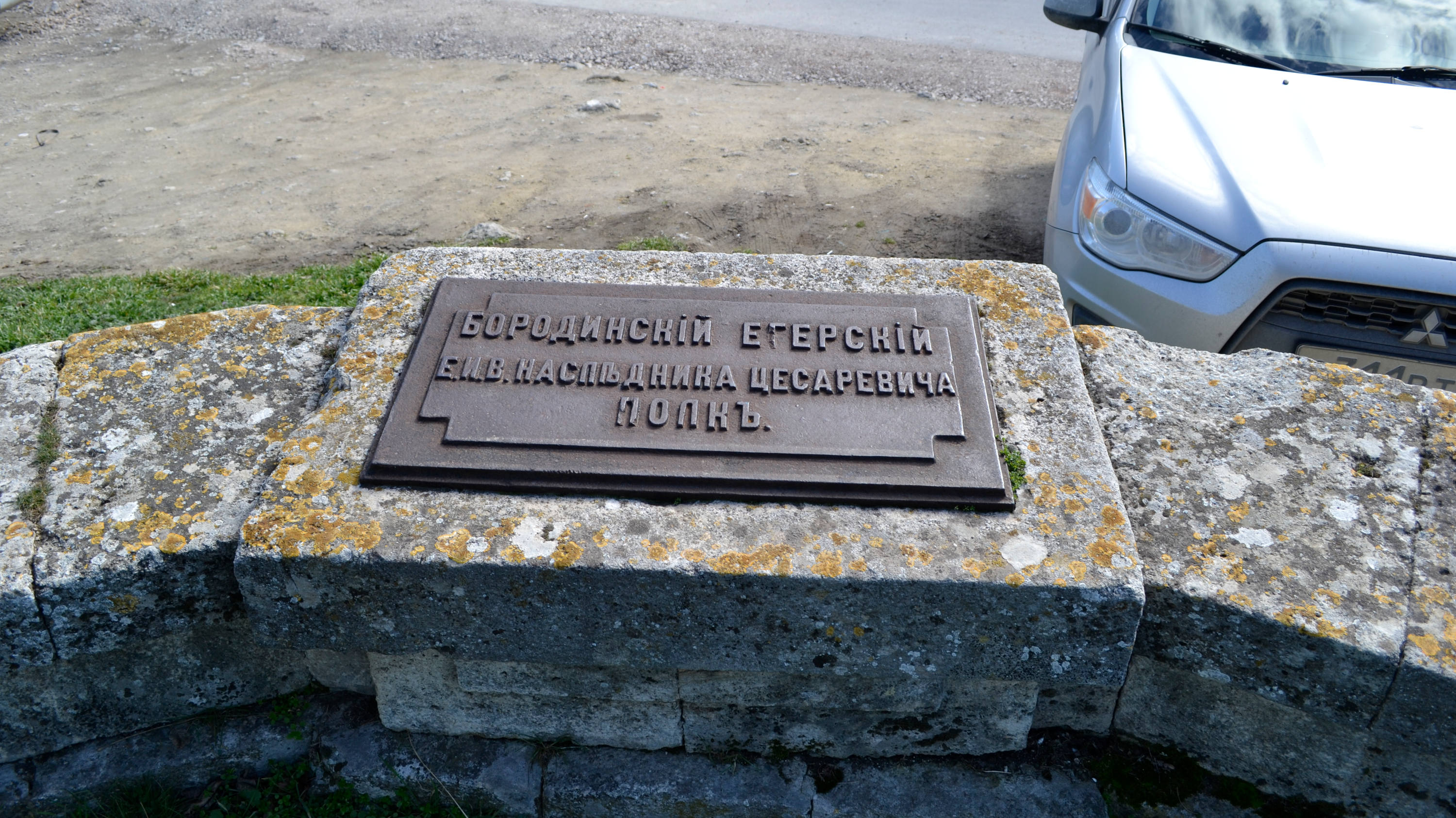 Пирамидка из пушечных ядер, на чугунном основании которой указаны даты обороны Севастополя «1854 – 1855», первая на нашем пути. На другой грани куба надпись «Линия обороны. Сохраняется коллективом ... Ноябрь 1969 г». Выходит, это новодел – восстановленная копия. Что и немудрено – металлические части могли не уцелеть после Второй мировой. Чьим коллективом сохраняется – непонятно, аббревиатуру не разглядеть, более крупно сфотографировать не догадался.