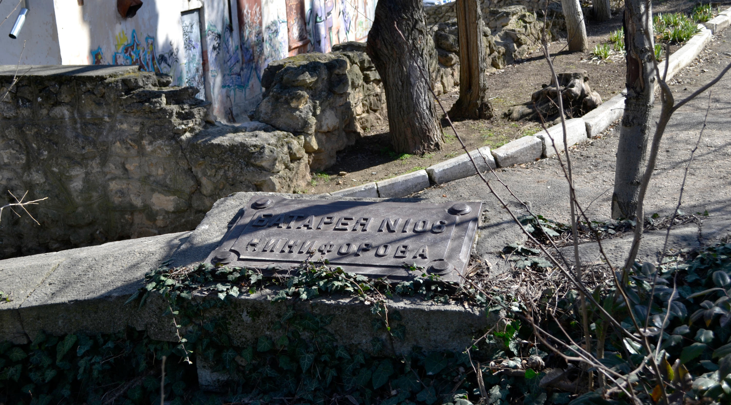 Мемориальная стенка вновь появляется на улице 2-й Бастионной у северо-восточного входа на Малахов курган – на пересечении с улицей Оборонной. Стенка заросла плющом и ежевикой, сквозь которые видна чугунная плита – здесь стояла батарея №106 Никифорова. На Малаховом кургане находилась еще одна батарея под командованием Никифорова – №84.