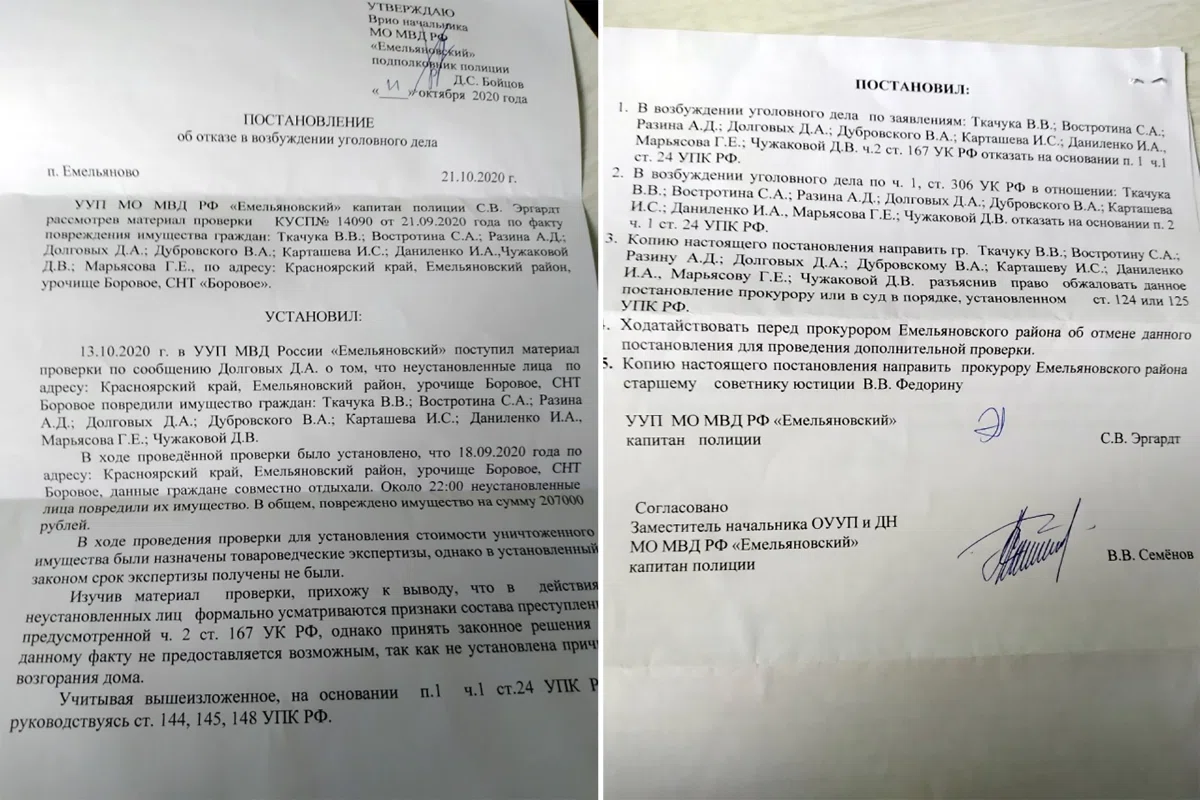 Первые две недели расследование велось активно. «Почти каждый день у меня были допросы, один даже на полиграфе, со мной часто связывался следователь», — вспоминает Игорь Карташов. — Но затем все резко прекратилось, а полиция перестала выходить на связь». А 12 ноября активистам пришло официальное постановление — отказ в возбуждении уголовного дела. Формулировка гласит, что «не установлена причина возгорания дома». Что за дом и как он оказался на месте платочного лагеря — неизвестно.