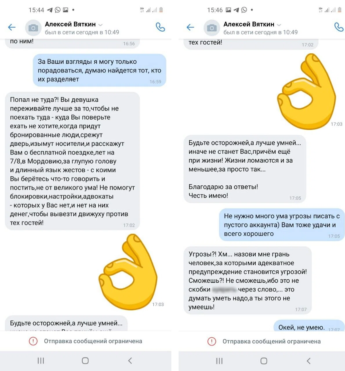 Активистка Дарья вспомнила, что за день до нападения ей написал с впоследствии удаленного аккаунта неизвестный под именем Алексей Вяткин. Вот сохраненная переписка с угрозами.