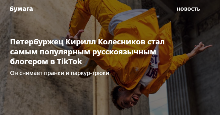 23-летний петербуржец Кирилл Колесников стал самым популярным блогером в русскоязычном TikTok. На его аккаунт с пранками и паркур-трюками подписано более 25 миллионов человек. Для сравнения: в сентябре прошлого года в аккаунте было чуть более 4 миллионов подписчиков.