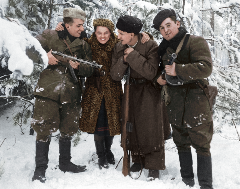 Фотограф Фаина Шульман (Фейга Лазебник) с партизанами отряда «Бригада Молотова» (Налибокская пуща, Беларусь, декабрь 1944 года). Шульман удалось бежать из гетто в местечке Ленин и присоединиться к партизанам; ее снимки — единственные известные фотодокументы, сделанные непосредственно участником партизанского отряда. Вся семья Шульман погибла в гетто в 1942 году.