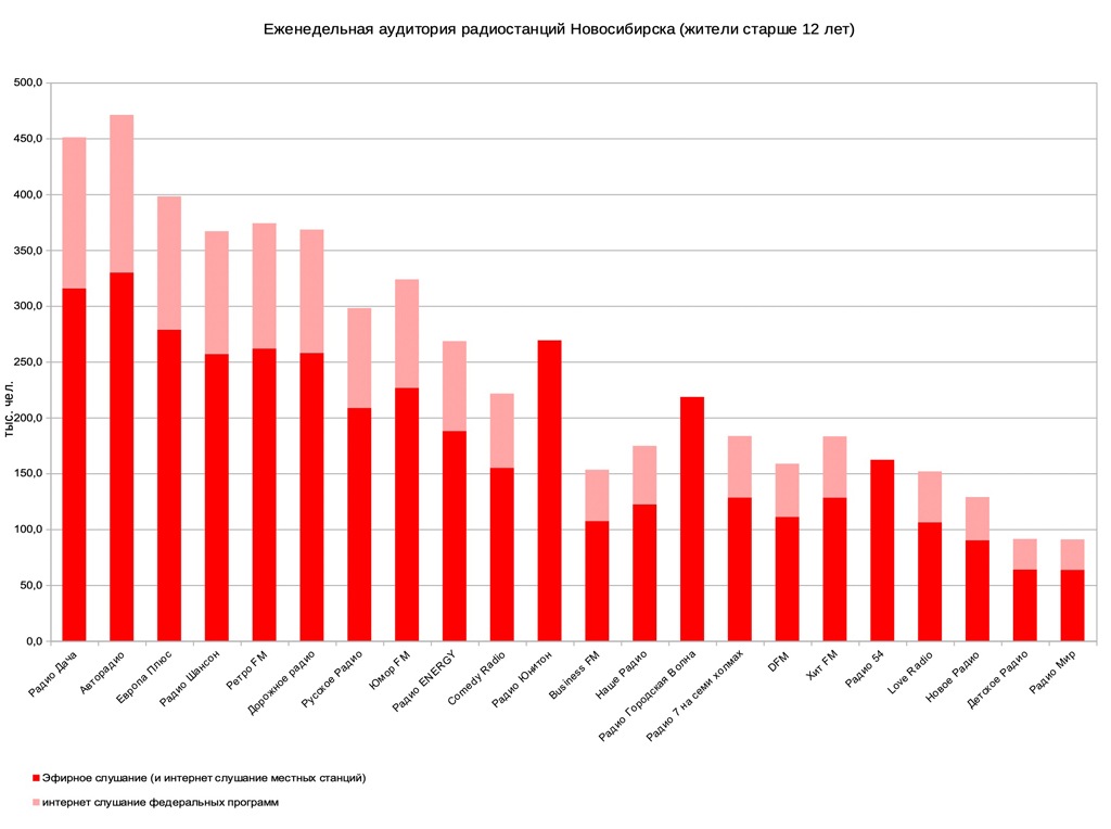 Вышло очередное исследование новосибирской аудитории федеральной компании «Медиаскоп», которое, по замыслу, должно быть инструментом медиапланирования при проведении рекламных кампаний. Исследование основываются на опросе горожан, которые должны вспомнить, какое радио и когда они слушали вчера и в течение недели. В нем не предусматривается получение ответа на вопрос «а каким техническим средством пользовался слушатель для каждого контакта с той или иной радиостанцией?» И это делает результат опросов «Медиаскопа» подходящим для федералов, но не совсем верным для местных рекламодателей.