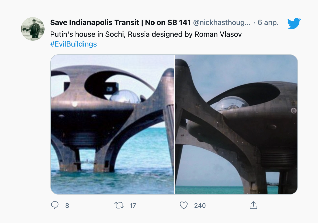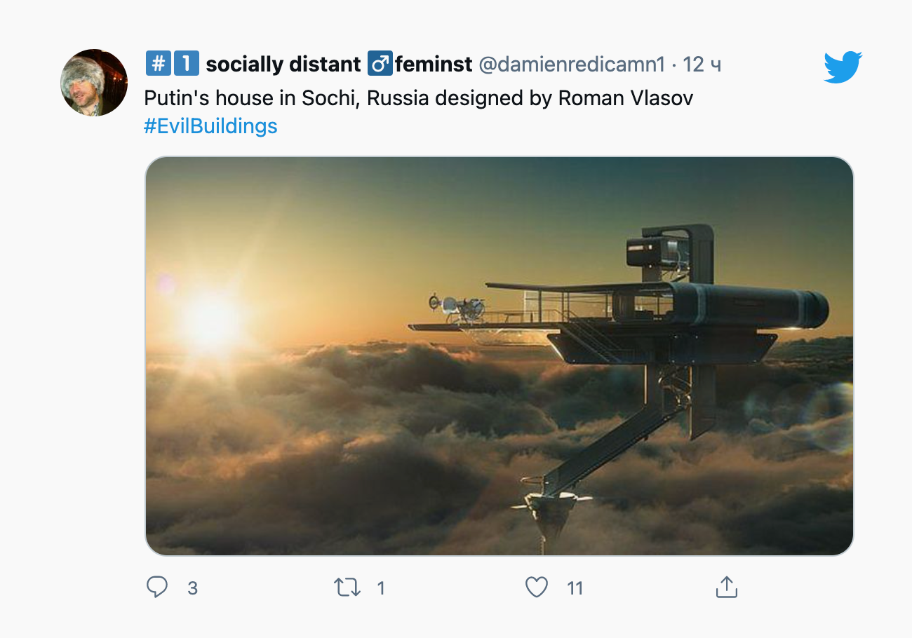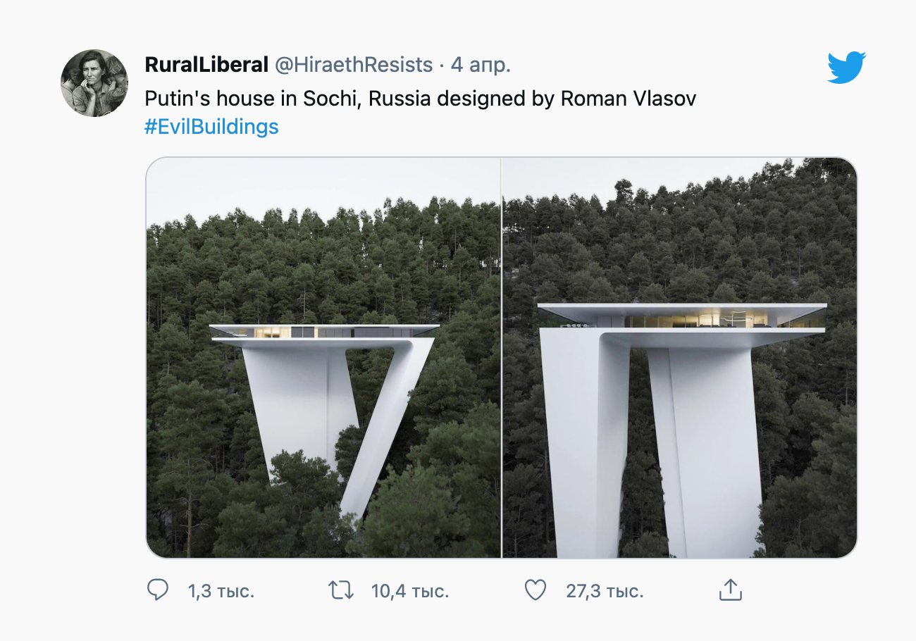 По твиттеру и другим соцсетям разошлись посты с концептами Власова и подписями вроде «Дом Путина в Сочи». Зарубежные пользователи с готовностью поверили, что президент России и правда живет как злодей из фильмов про Бонда: самые популярные твиты с сочинской виллой набрали сотни тысяч лайков.