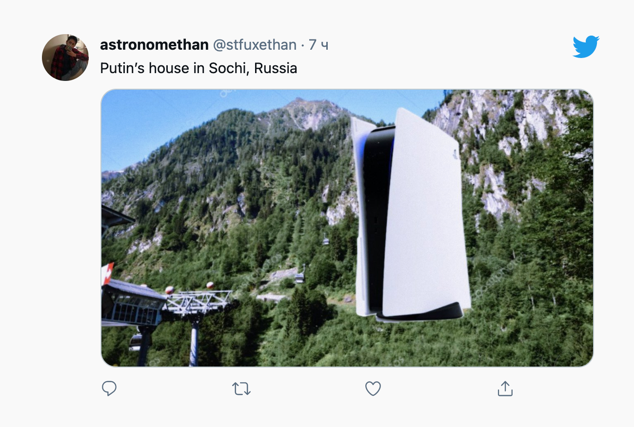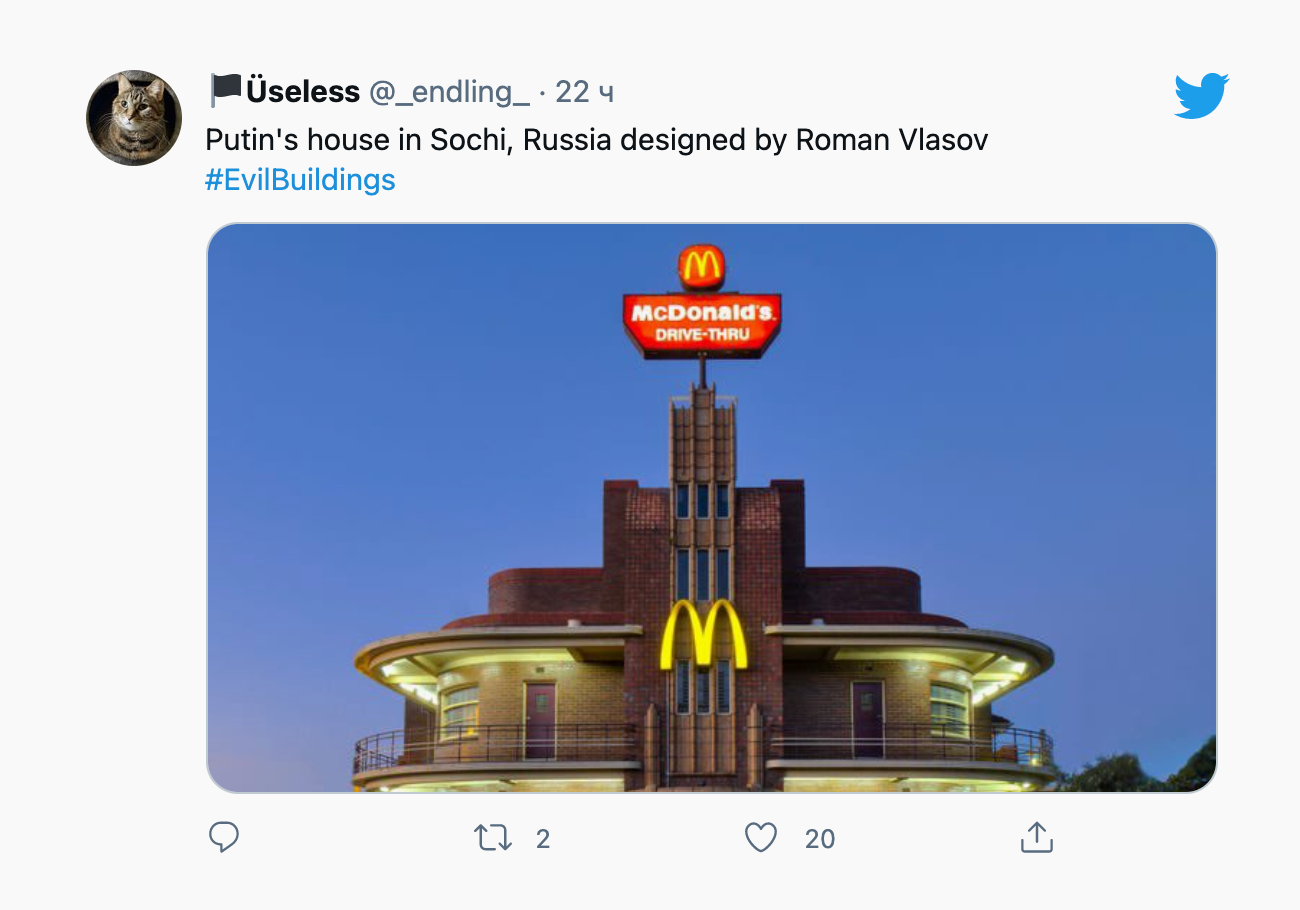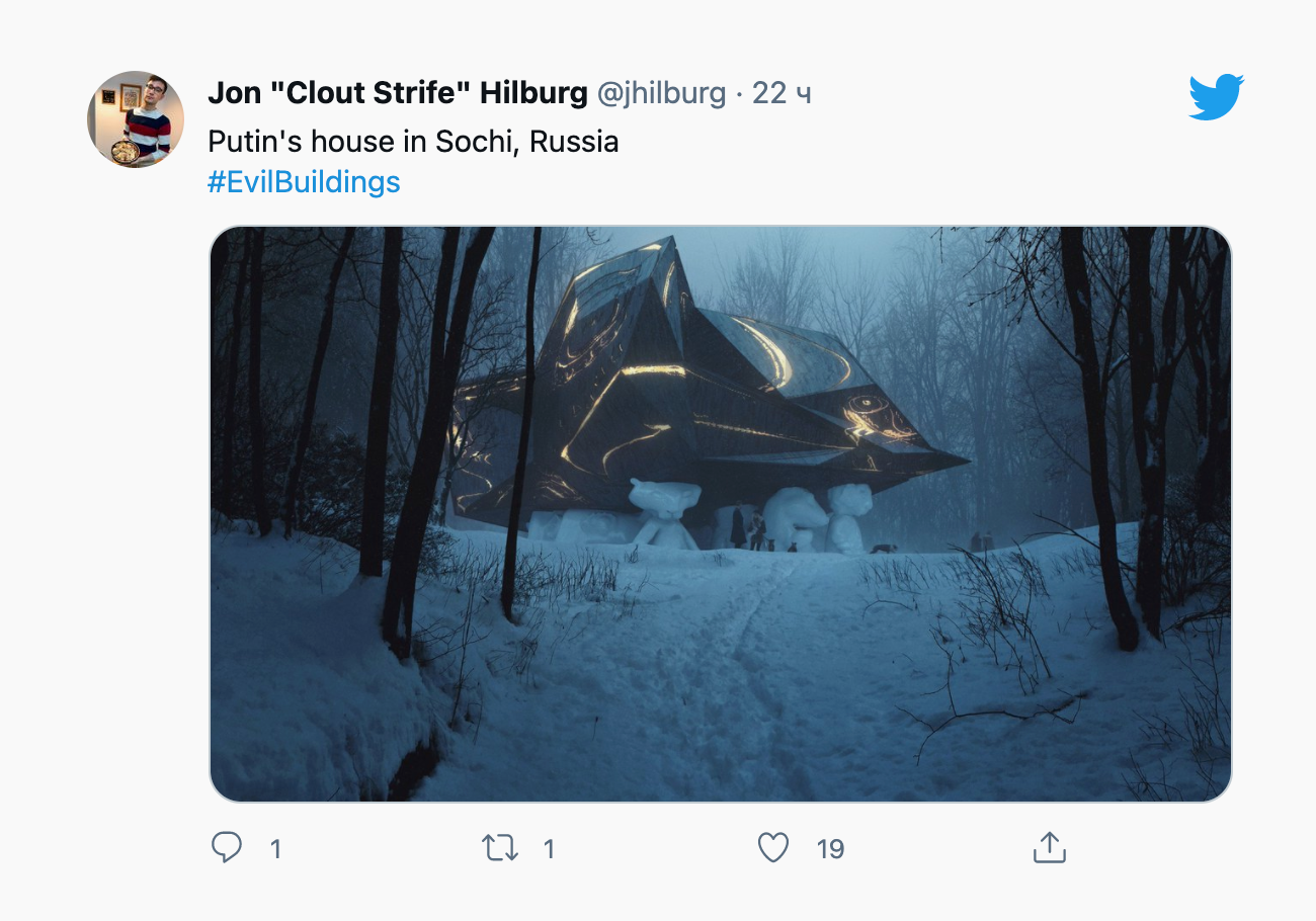 По твиттеру и другим соцсетям разошлись посты с концептами Власова и подписями вроде «Дом Путина в Сочи». Зарубежные пользователи с готовностью поверили, что президент России и правда живет как злодей из фильмов про Бонда: самые популярные твиты с сочинской виллой набрали сотни тысяч лайков.