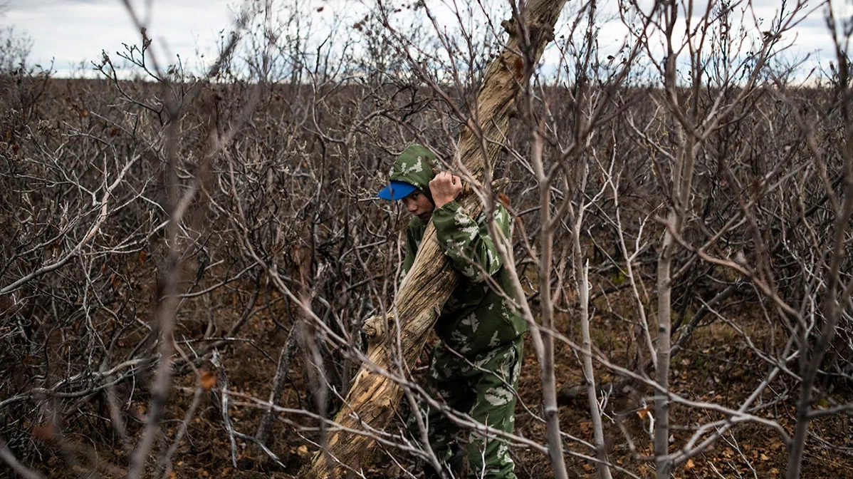 DESTRUCTION OF LOCAL FOOD SUPPLY. The catastrophic impact of climate change in the Russian Arctic limits the Nganasan's fishing opportunities — their primary food source. The government keeps restricting their hunting, too. This is a widespread ++source of tension++ between the Kremlin and indigenous communities elsewhere across Russia. With a de facto ban on hunting, the Nganasans stopped following the routes of wild herds, which weakened the entire population and led to reindeer husbandry's disappearance. Local lakes dry up, and reindeer herds thin out.