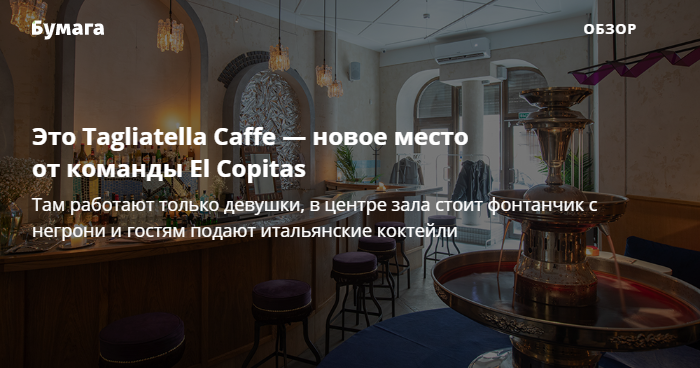 В Tagliatella Caffe команда обратилась к итальянской традиции аперитивов — легких коктейлей, которые обычно подают перед едой. Еще там работают только девушки, а в центре зала установлен стол, на котором стоит фонтанчик с коктейлем негрони.