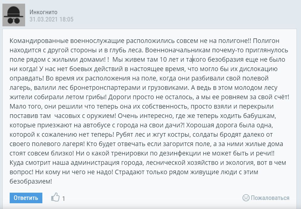 В социальной сети "ВКонтакте" есть фотографии и видео нового палаточного лагеря и полевого госпиталя, снятые к югу от СНТ "Березка" на южной окраине Воронежа. Это место расположено рядом с северной частью большого военного полигона Минобороны Погоново, ради создания которого в 50-е годы прошлого века здесь было уничтожено сразу несколько хуторов и деревень (сейчас потомки их жителей делятся друг с другом во "ВКонтакте" воспоминаниями о "довоенной" жизни). В комментариях под статьей местного издания "Моё! Воронеж", которое еще 27 марта сообщало об активности военных в районе станции Масловка, местные жители жаловались, что на этот раз военные разбили лагерь не на территории самого полигона, а через дорогу, в поле, в месте, примыкающем к жилым домам.