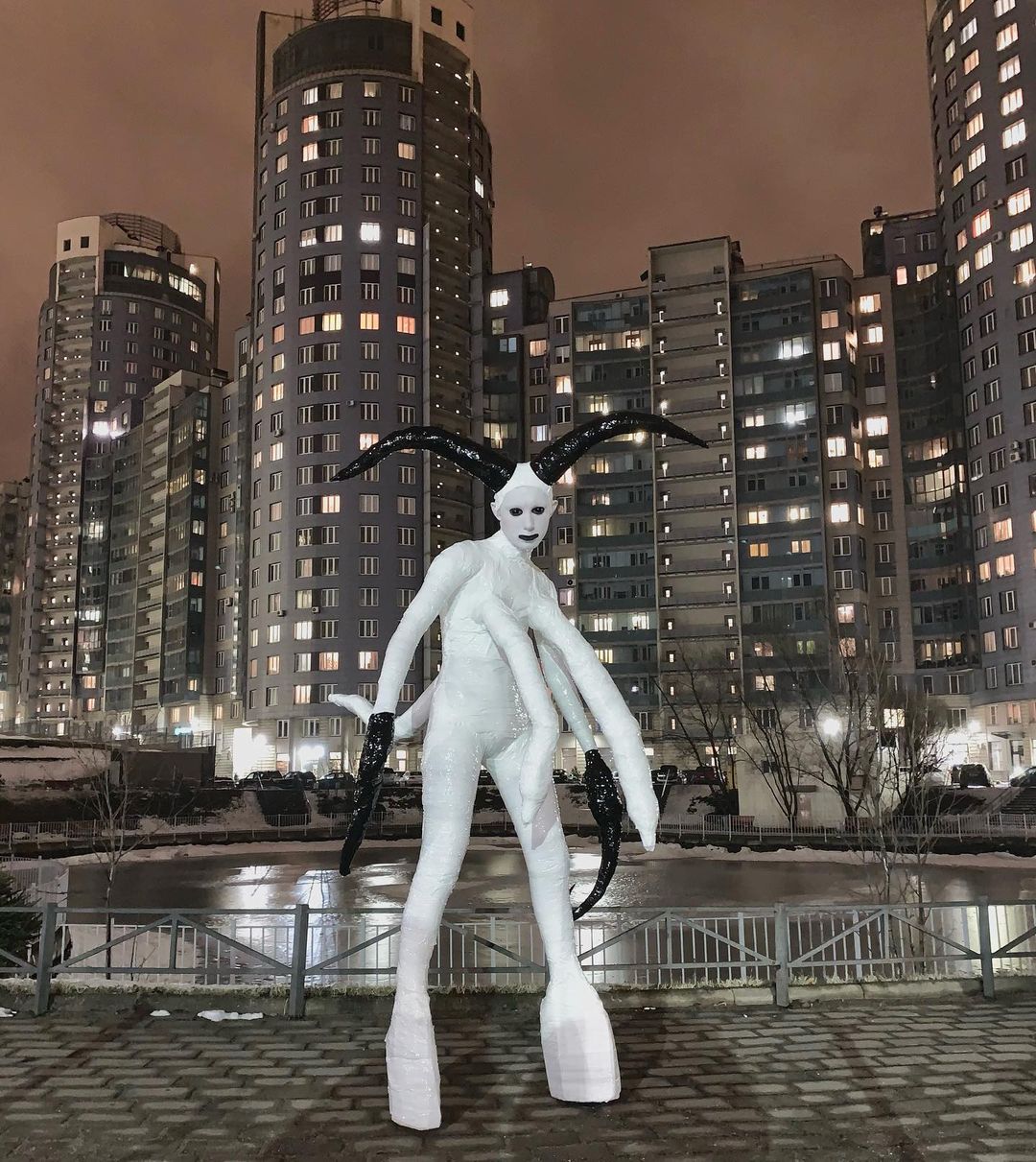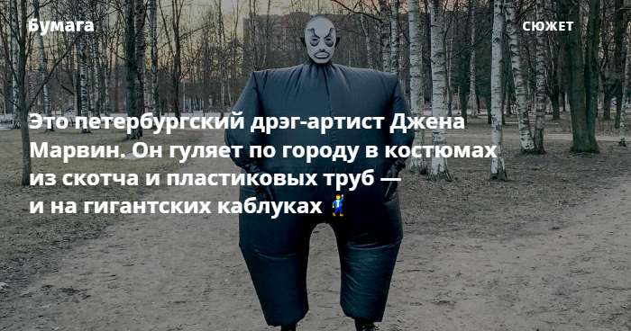 Дрэг-артист Джена Марвин носит яркий грим, высокие каблуки и гуляет по Петербургу то в огромном надувном костюме, то с длинными когтями и рогами. Свои наряды он создает из скотча и сантехнических трубок. Видео Марвина набирают миллионы просмотров в TikTok, а недавно он стал героем документального кино о российской дрэг-культуре.