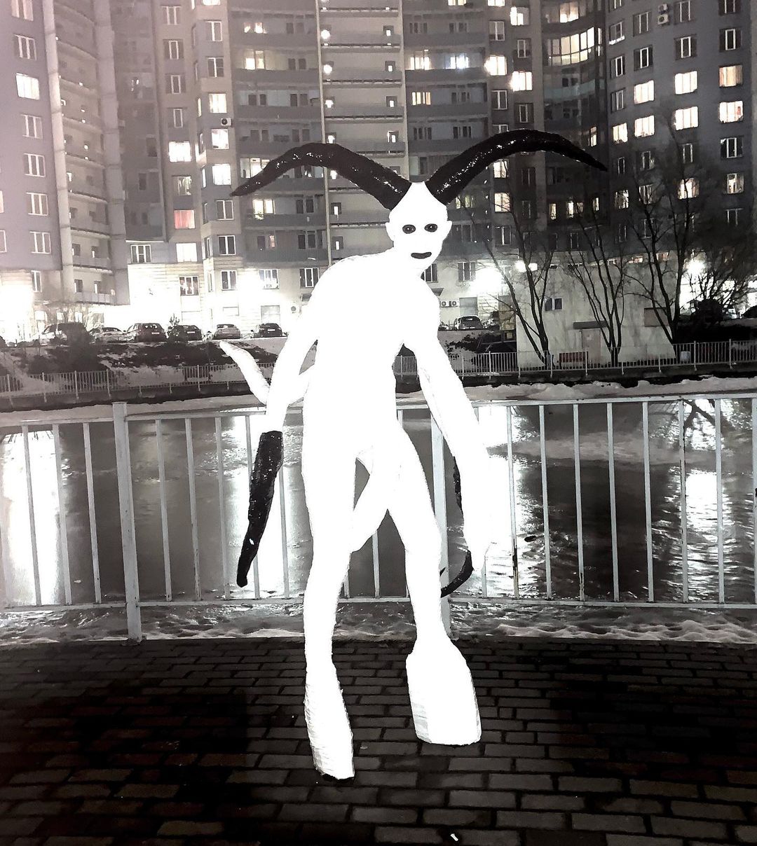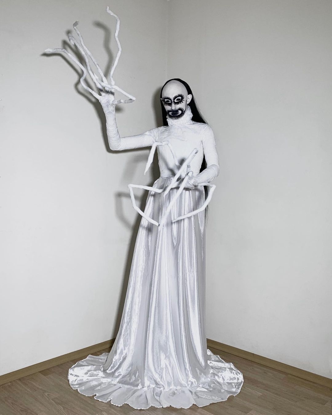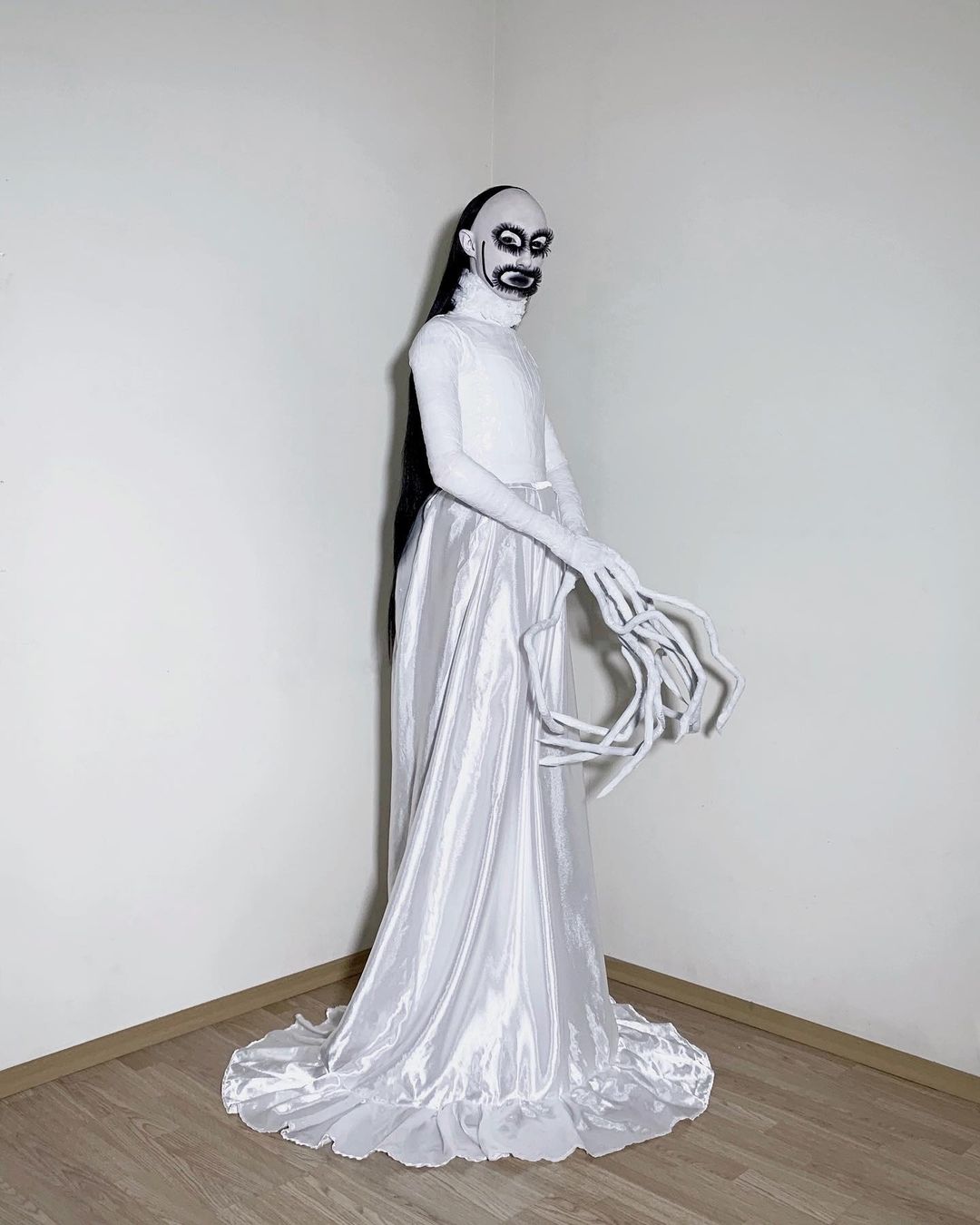 Джена купил много черного скотча, попросил знакомых его замотать и снял на видео получившийся образ — с черным париком, длинными когтями и белым гримом на лице. В TikTok ролик собрал 4,7 миллиона просмотров.
