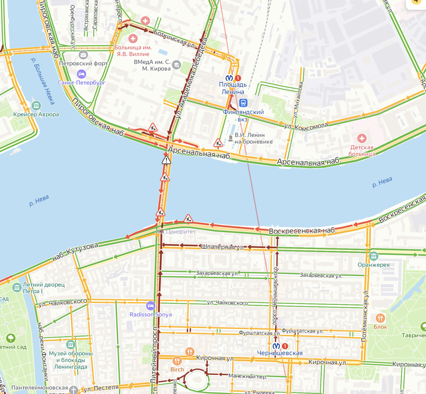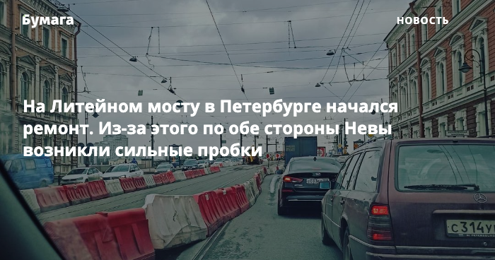 Ремонт спровоцировал сильные пробки по обе стороны Литейного моста: стоит Шпалерная улица, Литейный проспект, Воскресенская и Пироговская набережные, улица Академика Лебедева, а также Боткинская улица.