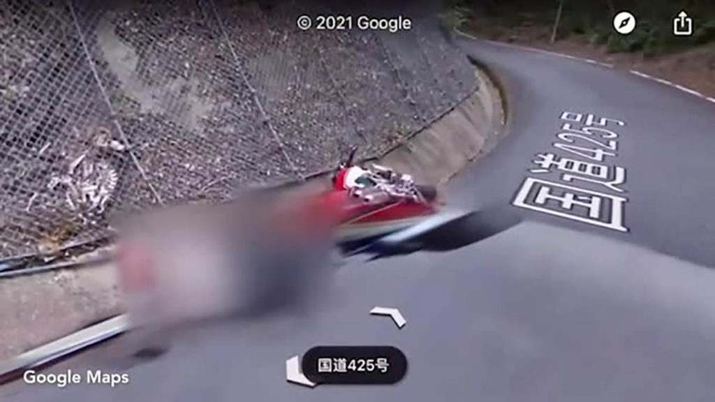 В марте камера Google Maps во время съемки местности на холмистом участке дороги в Японии запечатлел падение мотоциклиста. На фотографии видно, что мотоциклист лежит на обочине рядом с мотоциклом, а рядом с ним за защитной сеткой лежит скелет какого-то крупного животного. Пользователи Reddit предположили, что это могли быть останки оленя.