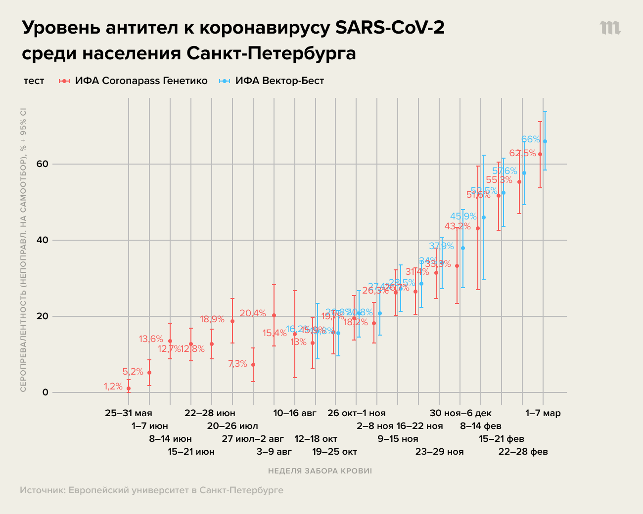 В стране проводится не так много регулярных массовых исследований на наличие антител к коронавирусу, в которых бы делалась поправка на нерепрезентативность выборки. Очередной отчет по одному из таких исследований, которое проводится Европейским университетом в Санкт-Петербурге, показал, что в феврале — марте антитела к вирусу были у половины населения города (при 7% вакцинированных). Однако эти данные нельзя экстраполировать на всю Россию.