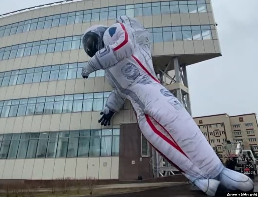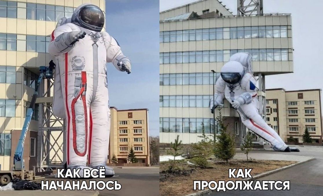 В день космонавтики 17-метрового надувного космонавта, установленного у здания Сибирского федерального университета, разорвало ветром. Фигура приветствует участников Красноярского экономического форума перед входом в университет.