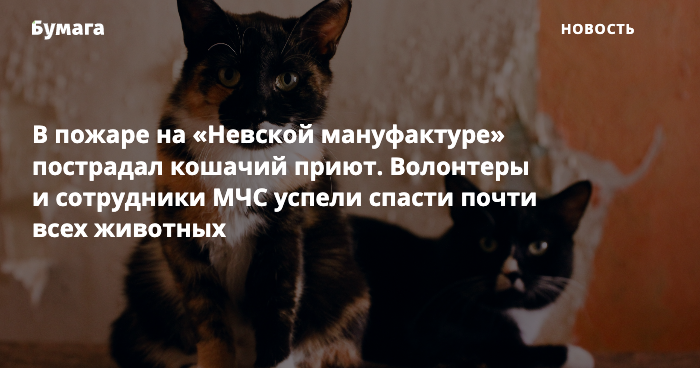 При пожаре на «Невской мануфактуре» пострадал кошачий приют «Пушистые лапки». Об этом «Бумаге» сообщила Галина Никитина, волонтер проекта.