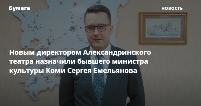 Бывшего министра культуры Республики Коми Сергея Емельянова назначили директором Александринского театра. Об этом пишет «Интерфакс» со ссылкой на замминистра культуры РФ статс-секретаря Аллу Манилову.