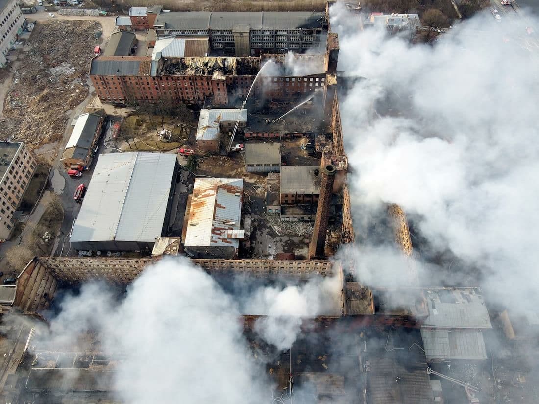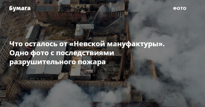 Огонь почти полностью уничтожил «Невскую мануфактуру» на Октябрьской набережной. От здания предприятия, основанного еще в XIX веке, во многих местах остались лишь стены: во время пожара обрушились кровля и межэтажные перекрытия. Над постройкой всё еще клубится густой дым. «Бумага» показывает, как выглядит «Невская мануфактура» после разрушительного пожара.