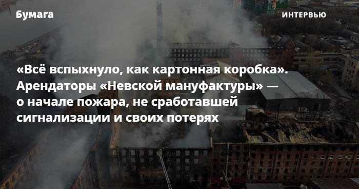 Часть помещений сгоревшего здания сдавали в аренду — там находились студии и производства. Накануне работникам удалось вовремя покинуть офисы, но у некоторых в пожаре сгорело всё оборудование. «Бумага» поговорила с арендаторами «Невской мануфактуры» — о том, где начался пожар, как происходила эвакуация и какие проблемы возникли при тушении.