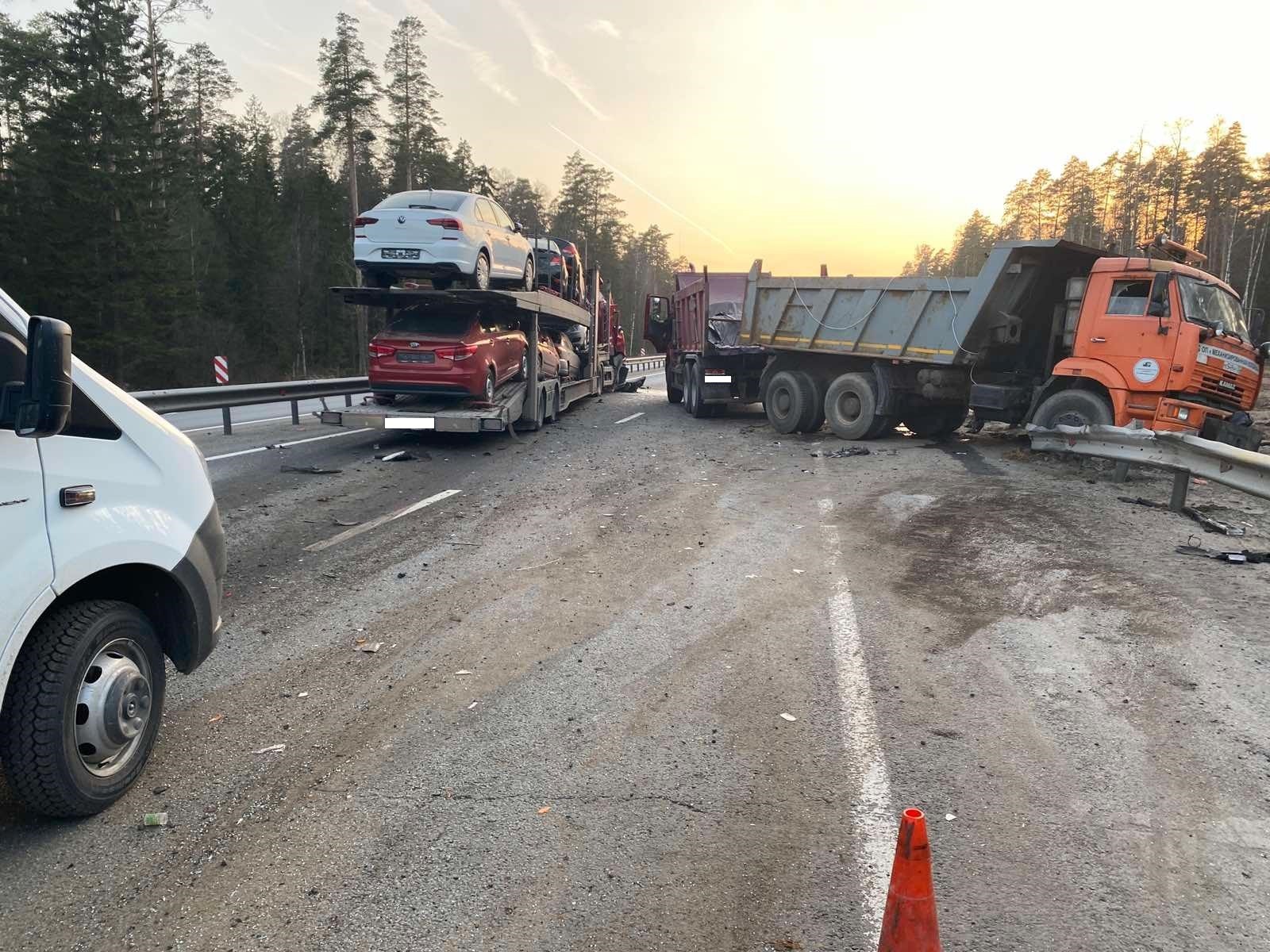 По сообщению ГИБДД, причиной аварии стало опасное вождение водителя автопоезда “Скания”, который не соблюдал безопасную дистанцию, в результате чего врезался в ехавший перед ним КаМАЗ.