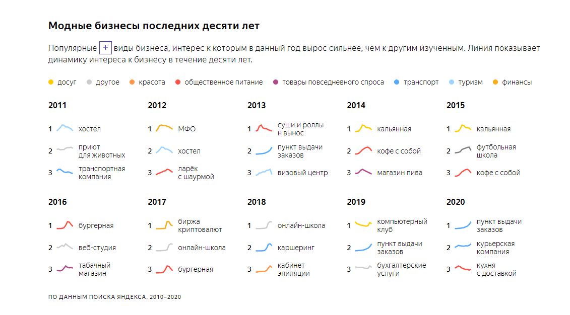 «Яндекс» опубликовал исследование, которое интересно порассматривать, — компания проанализировала запросы россиян об открытии нового бизнеса за 10 лет и вывела главные закономерности. Самым модным новым бизнесом 2020 года в «Яндексе» стал пункт выдачи заказов из интернет-магазинов, на втором и третьих местах — курьерские компании и кухни с доставкой (все — неудивительно). Но не менее интересно рассмотреть исторический график за 10 лет — как исчезали мечтатели о ларьке с шаурмой (последнее появление в топе — 2012 год) и магазинах пива (2014-й). Впрочем, пожалуй, самое грустное и ностальгическое — «визовый центр» в топе 2013 года.