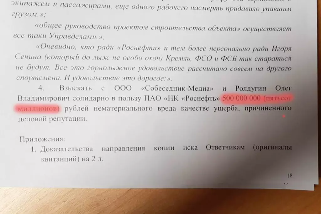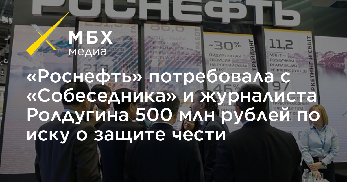 «Роснефть» потребовала с «Собеседника» и журналиста Ролдугина 500 млн рублей по иску о защите чести
