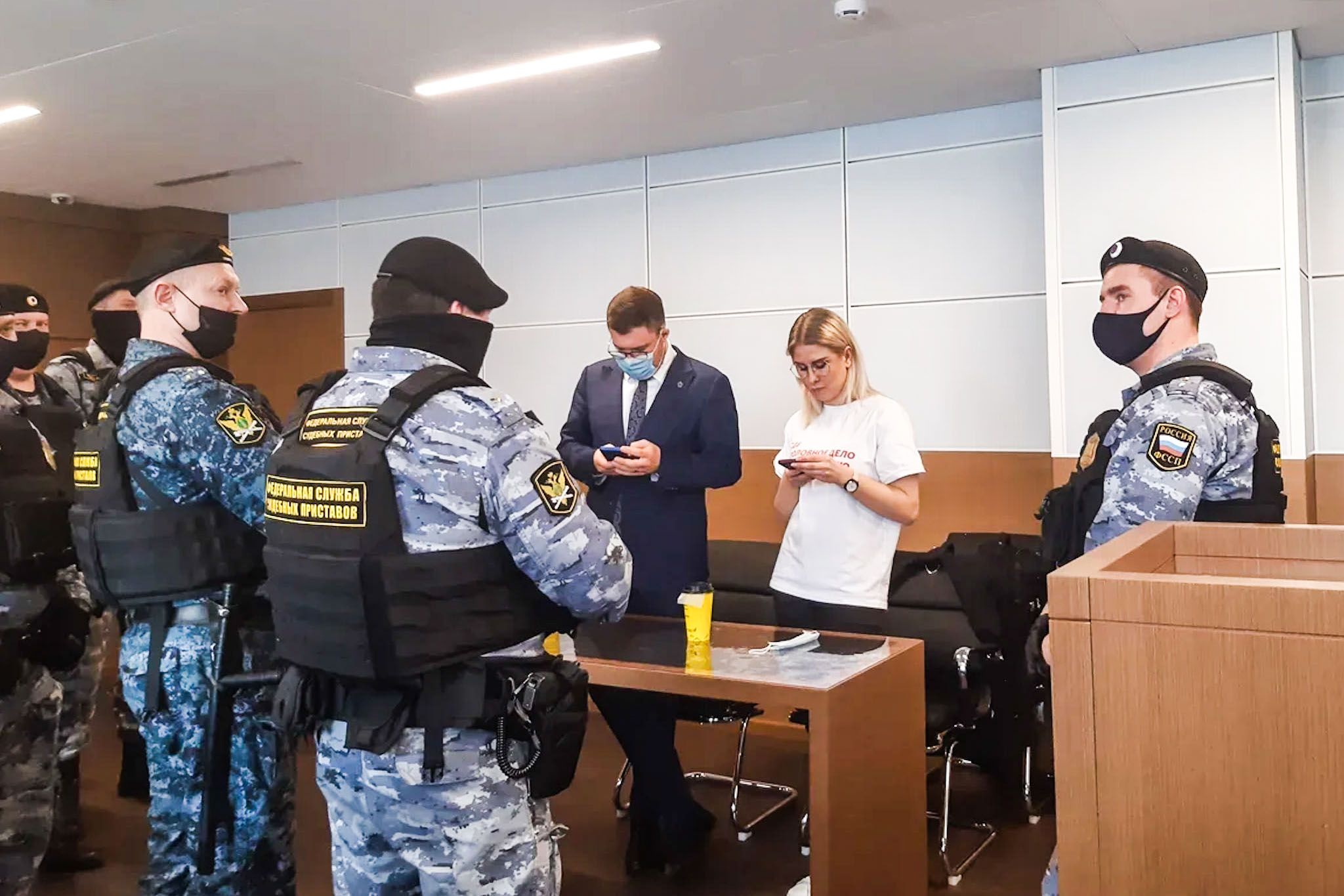 Lyubov Sobol pays no attention to the judge — she’s reading something on her phone. Her lawyer, Vladimir Voronin, isn’t listening either. Nor is the prosecutor. Only Kudryavtsev’s mother-in-law, Galina Subbotina, and his wife, Irina Kudryavtseva, are watching the judge with interest.