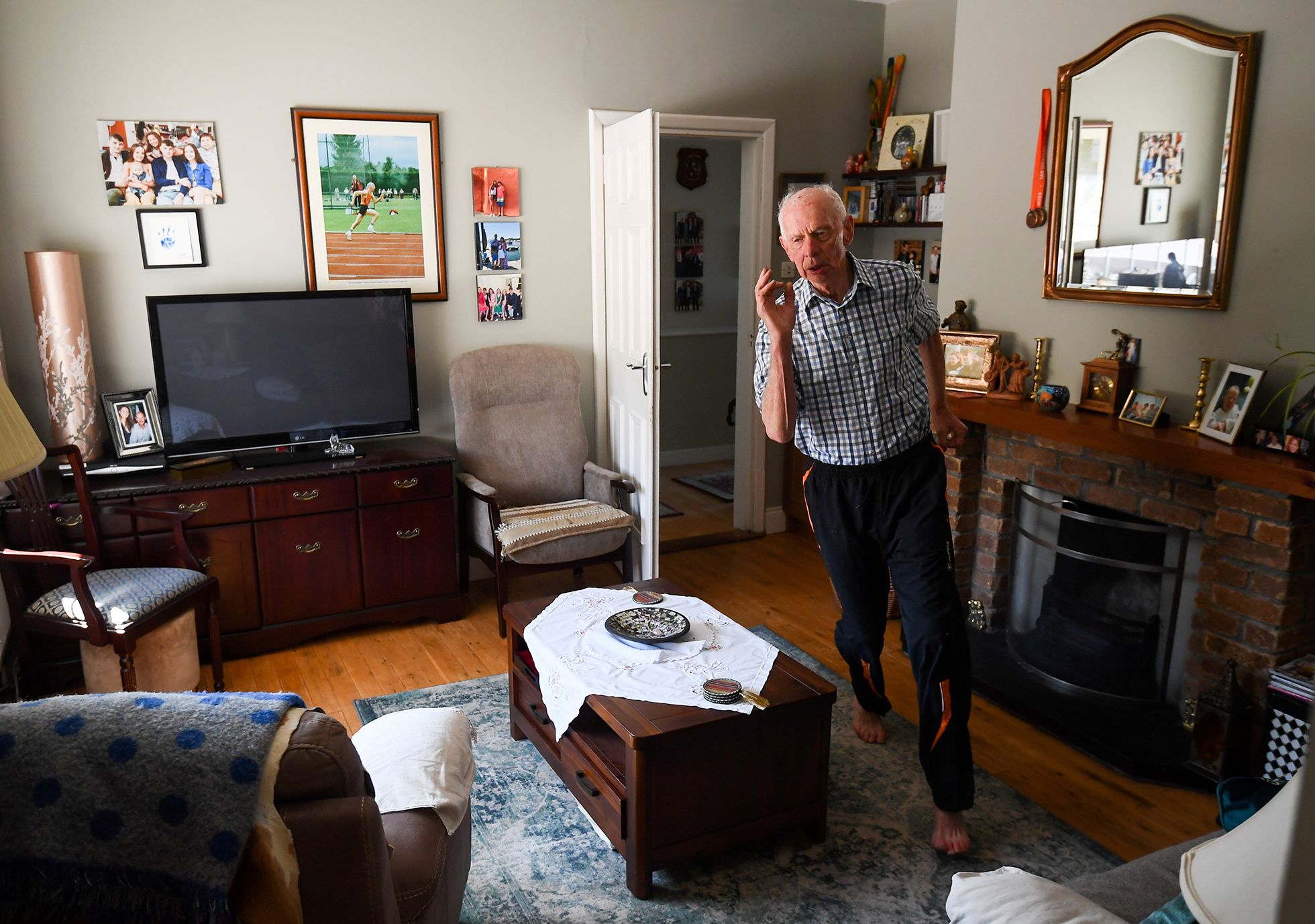 87-летний атлет-ветеран Пэт Нотон тренируется у себя дома в Ирландии во время объявленного из-за ковида локдауна. 4 мая 2020 года