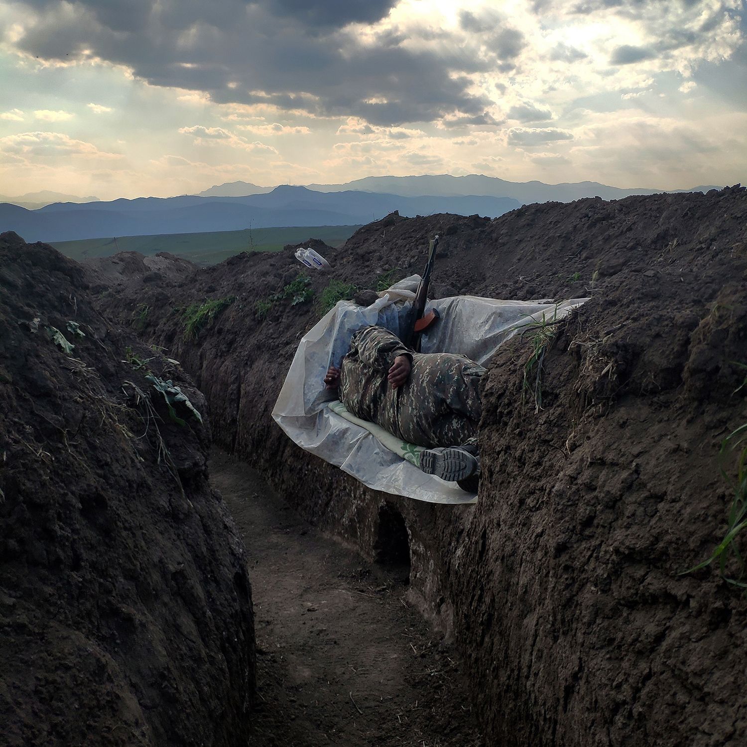 Военнослужащий отдыхает в окопе у армянского села Неркин Хндзореск, расположенного на границе с Азербайджаном. 31 октября 2020 года