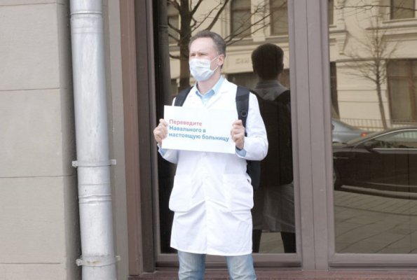 Последние несколько дней возле АП проходят одиночные пикеты с требованием предоставить Алексею Навальному возможность лечиться у своего врача. 13 апреля на том же месте задержали члена «Альянса врачей» Кирилла Бородина, но отпустили без протокола.