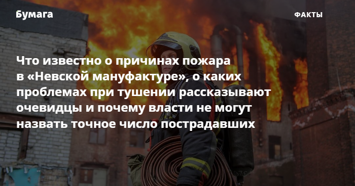 Обновление от 16 апреля: в пресс-службе ГУ МЧС по Петербургу «Бумаге» сообщили, что все гидранты на территории «Невской мануфактуры» на момент тушения пожара были исправны. Воду из Невы использовали в борьбе с огнем из-за того, что спасателям нужны были ее большие объемы — из-за конструктивных особенностей здания, а также для защиты соседних помещений и строений. «В связи с этим использование воды только из пожарных гидрантов было нецелесообразно, поэтому руководством тушения пожара было принято решение установить насосные станции на естественный водоисточник — реку Нева», — пояснили в ведомстве.