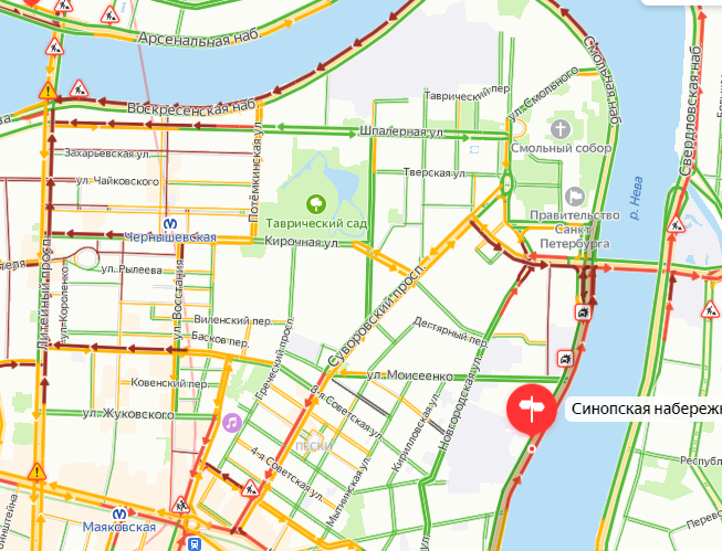 К вечеру четверга, 15 апреля, на Синопской набережной образовалась пробка от моста Александра Невского до Большеохтинского моста. Это следует из данных сервиса «Яндекс.Пробки».