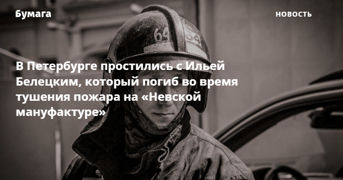 Накануне Владимир Путин наградил орденом Мужества петербургских пожарных — погибшего Белецкого и двух пострадавших при тушении пожара в здании «Невской мануфактуры». Семье Ильи Белецкого из резервного фонда правительства Петербурга выплатят 1 миллион рублей.