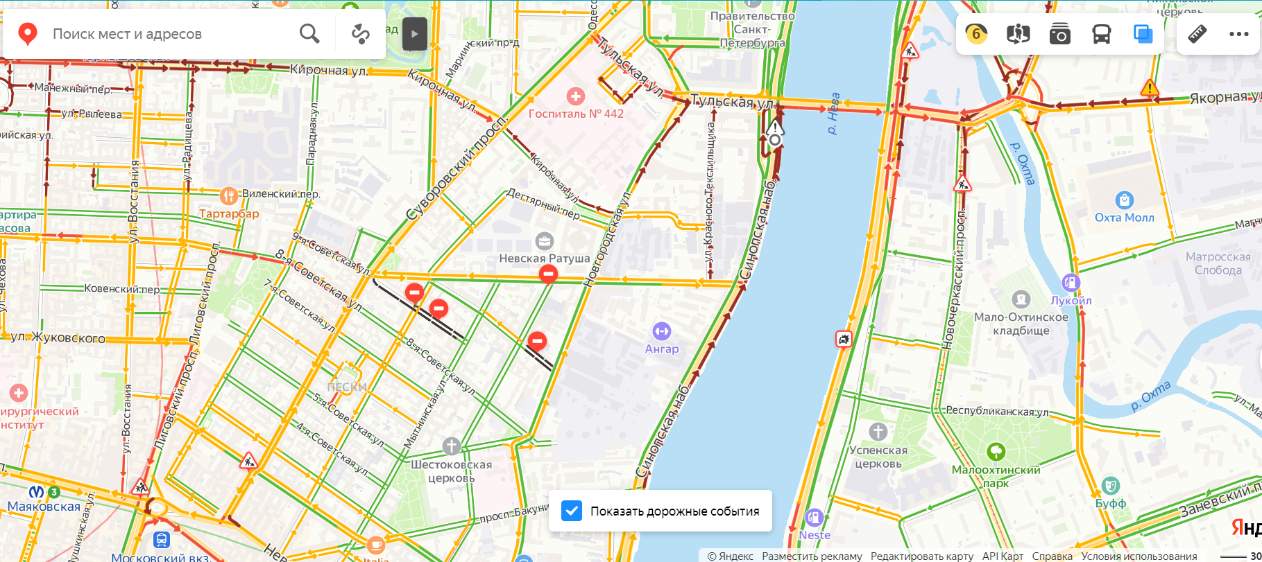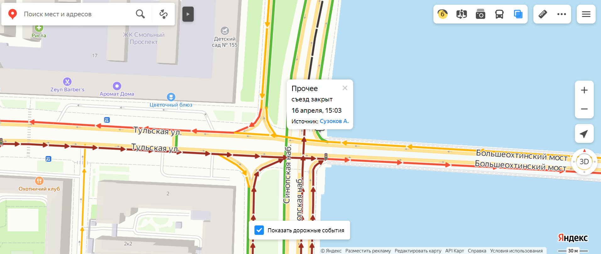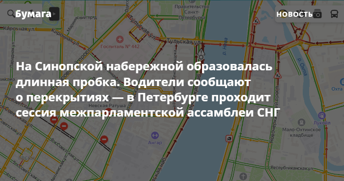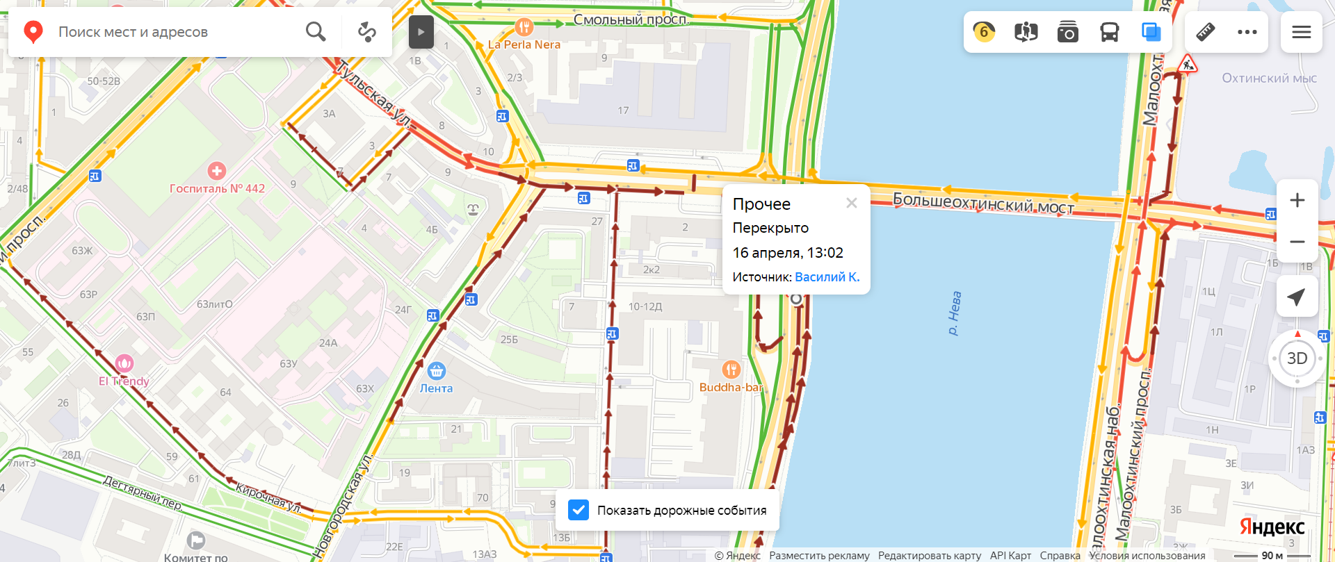 Также затруднено движение по Большеохтинскому мосту, Малоохтинскому проспекту, Якорной улице, Комаровскому мосту, Тульской, Новгородской, Таврической и Кирочной улицам. Автомобилисты пишут, что закрыт съезд с Большеохтинского моста на Синопскую набережную.