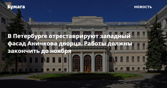 В Петербурге отреставрируют западный фасад Аничкова дворца. Работы должны быть завершены до ноября 2021 года, следует из данных портала госзакупок.